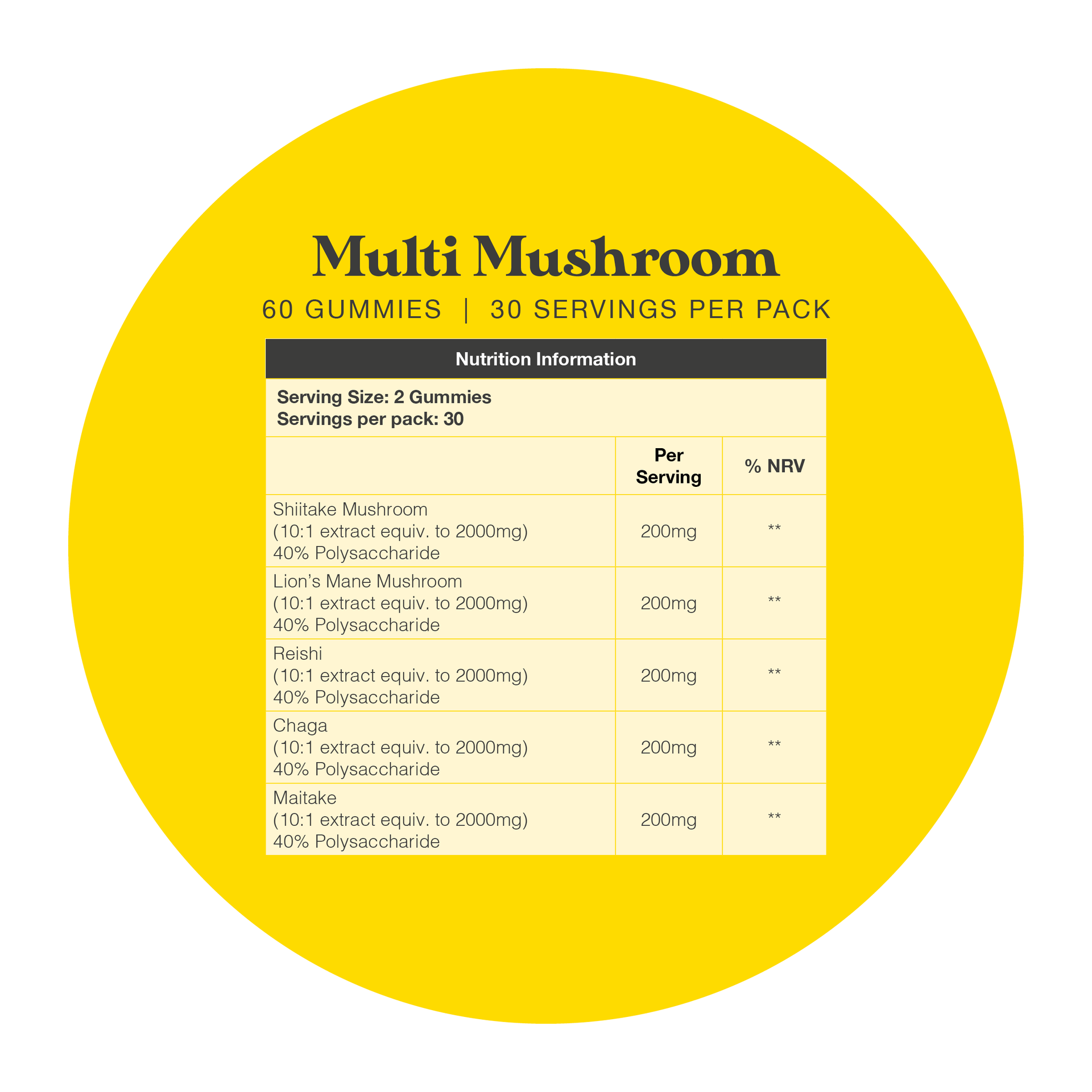 Our Multi Mushroom is the Ultimate Blend of functional mushrooms and is perfect for anyone looking to take the optimum dose in one easy product. This pro-athlete approved mushroom supplement combines 5 log-grown extracts to bring you a hefty daily dose of 10,000mg per 2 gummies.