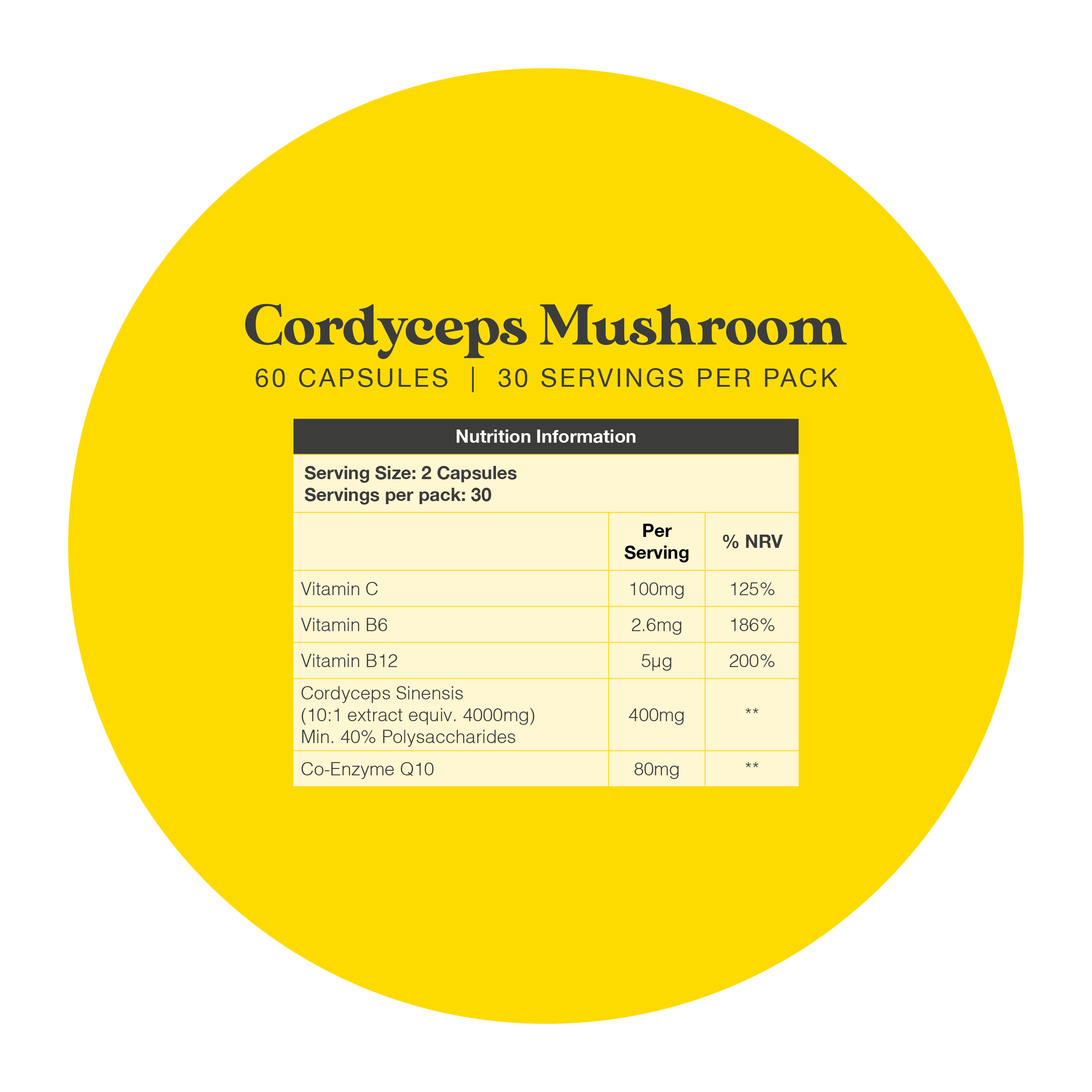Our Performance Blend Mushroom complex combines Cordyceps and CoQ10 with the power of Vitamins C, B6 and B12 to support physical performance, energy and recovery. This pro-athlete approved mushroom supplement provides 4,000mg of Cordyceps per 2 capsules and is perfect for those looking to improve their PB's, reduce tiredness and reach new performance goals.