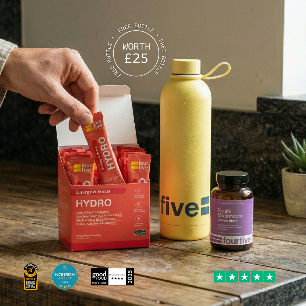 The fourfive Starter Kit is designed to help you feel clear, energised and in control from morning through to night. It supports sustained focus and clean energy during the day, then helps you properly switch off, recover and sleep when it counts. The Starter Kit combines fourfive Hydro Energy & Focus (30 sachets) for steady, crash free energy and hydration, fourfive Reishi Mushroom Capsules traditionally used to support relaxation and quality sleep, and a fourfive Bottle, free on your first order. Worth £80 including the bottle, The Starter Kit is available on subscription with 30% off your first three orders, making it just £38.50, delivering a simple daily rhythm that works with your body and supports performance where it matters most.