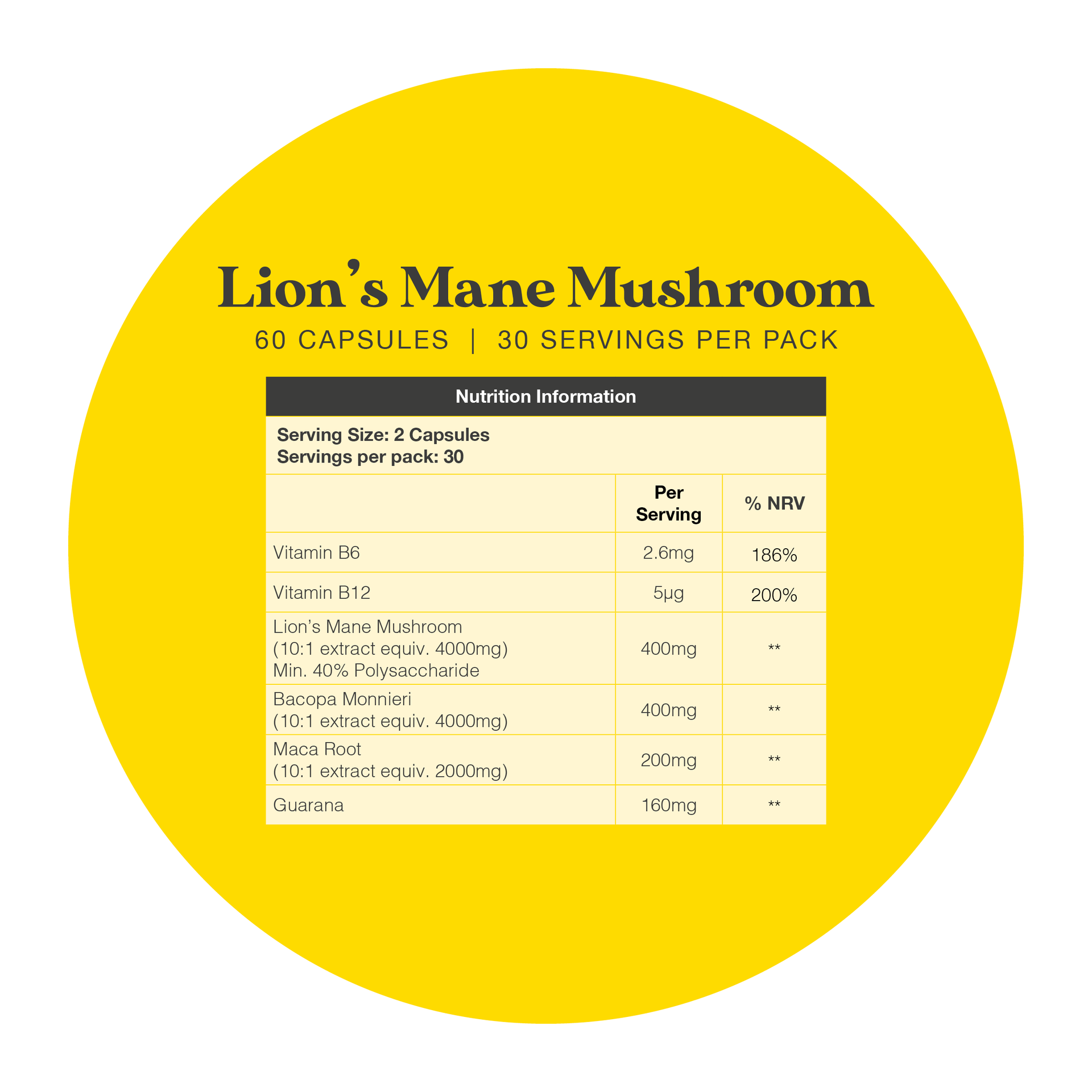Our Energy & Focus Mushroom complex combines Lion’s Mane, Bacopa Monnieri and Guarana with the power of Vitamins B6 and B12 to support brain function, focus and energy. This pro-athlete approved mushroom supplement provides 4,000mg of Lion's Mane per 2 capsules and is perfect for those looking to improve focus and reduce tiredness and fatigue.